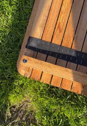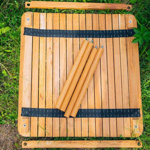 - Campingtisch aus edlem Eichenholz: Unser aufrollbarer Camping-Tisch wird aus hochwertigem Eichenholz gefertigt, das äußerst robust und stabil ist. Wir haben bis zu 55 kg ohne Probleme aufladen können.